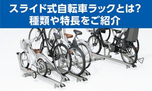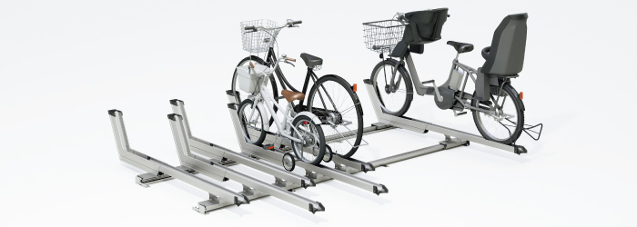 駐輪時、自転車を1台ずつラックに入れることで整然と並べられます。2本レール仕様でスライドが安定する仕様です。ラックが左右にスライドするため自転車の出し入れが簡単になります。自転車は質量40kgまで対応し、子乗せ電動アシスト自転車も収納可能です。