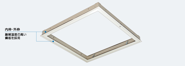 CFP型は、45分または60分の準耐火構造に対応した点検口枠です(自社試験調べ)。点検口枠は融解温度の高い鋼板を採用しています。気密性能は「JIS A 4706(A-4等級相当)」です。