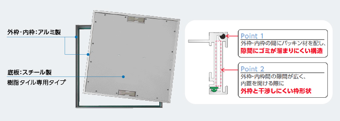 コンクリートスラブ用アルミ枠・目地の床点検口です。枠の隙間に砂やゴミが溜まりにくい構造をしています。樹脂タイル用(貼りしろ3mm)です。