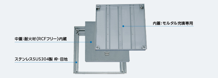 コンクリートスラブ用ステンレス目地の耐火材付き床点検口です。通常の内蓋の下に耐火材(RCFフリー)を納めた中蓋を入れる二重蓋仕様です。