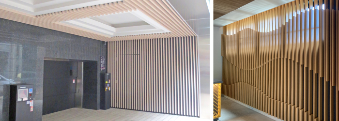 直付けによって下地が見えないスマートな意匠性のルーバー。内装・外装対応。木目シートのカラーバリエーションも豊富で「不燃木目調シート」もラインアップしています。
