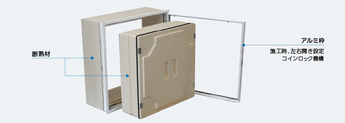 省エネ基準対応の気密断熱タイプです。気密性能:JIS A 4706・A-4等級相当。内蓋の奥に専用の断熱材を入れることにより断熱性も確保します(断熱材は1型地域用/2型地域用から選択可能)。