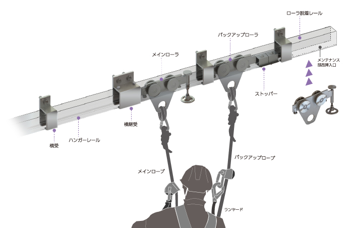 ローラは、吊り下がるメインロープを掛ける「メインローラ」と、安全帯の命綱(バックアップロープ)を掛ける「バックアップローラ」の2種類を使用します。
