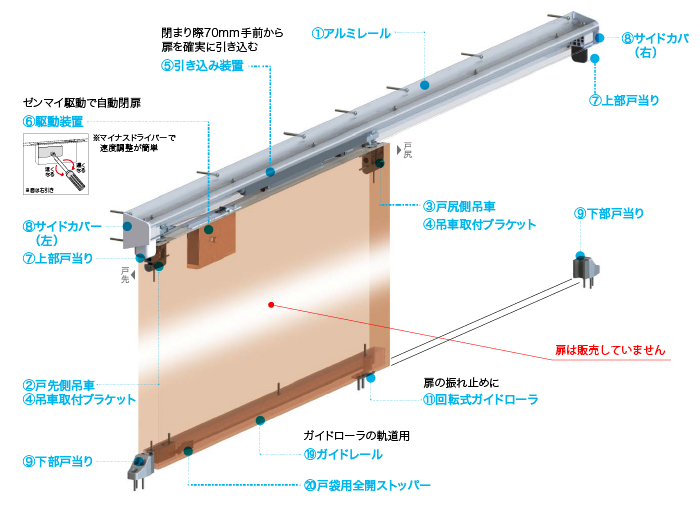 ポイントは『自動で引き戸が閉まる機械式の自閉機構』、『公共施設での使用に対応する耐久性』、『必要な部品がセット販売で選びやすい』、『国内自社工場で開発・製造』といった点が挙げられます。