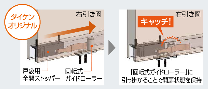 全開状態を保持する「戸袋用全開ストッパー」を標準搭載《ダイケン オリジナル》